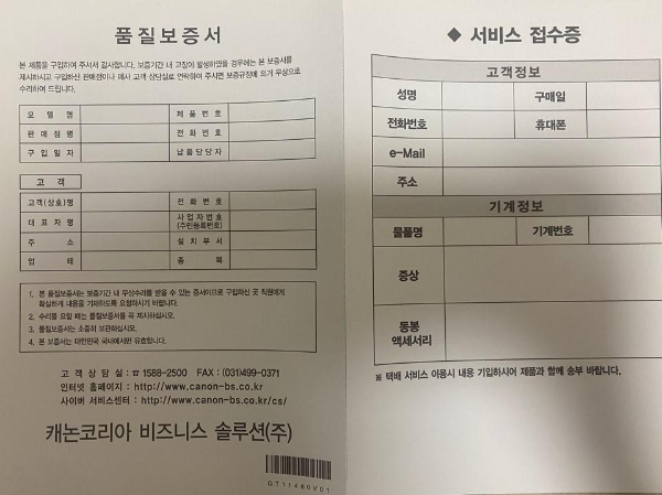 먼저 주문하시면 캐논측에서 품질 보증서가 같이 오게 됩니다. (사용 설명서와 컴퓨터 설치 CD도 같이 들어있습니다.)이것은 구입일로부터 1년간 무상으로 수리가 가능하다는 내용입니다.
